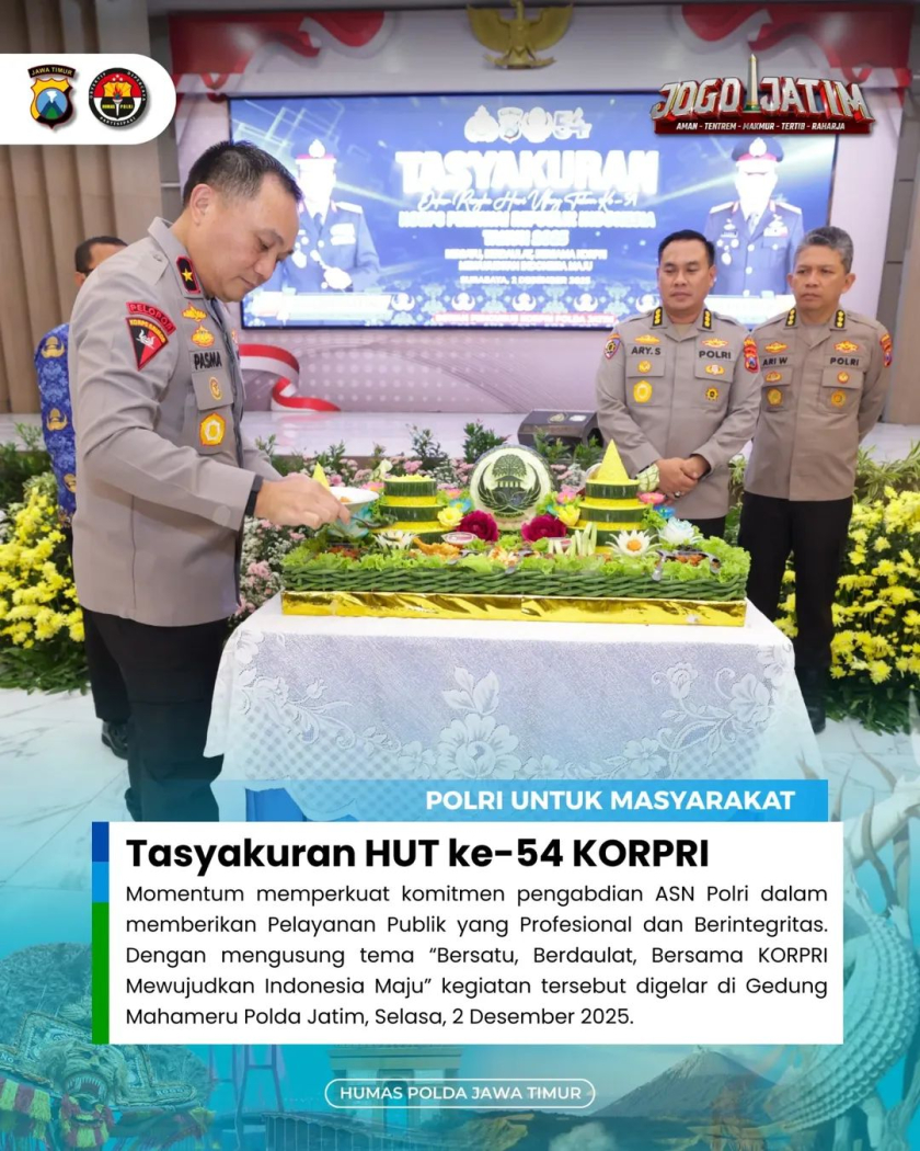 Surabaya — Kepolisian Daerah Jawa Timur menggelar acara tasyakuran Hari Ulang Tahun ke-54 KORPRI di Gedung Mahameru Polda Jatim, Selasa 2 Desember 2025.
