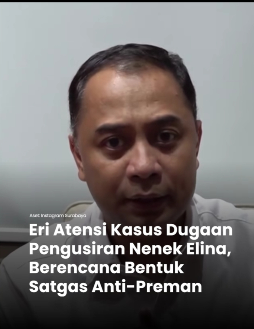 Wali Kota Surabaya, Eri Cahyadi, menegaskan komitmen penuh Pemerintah Kota (Pemkot) Surabaya dalam mengawal proses hukum atas dugaan pengusiran yang dialami Nenek Elina dari rumahnya. Kasus tersebut dinilai sebagai persoalan serius yang menyangkut rasa aman dan keadilan bagi warga Surabaya, khususnya kelompok rentan.