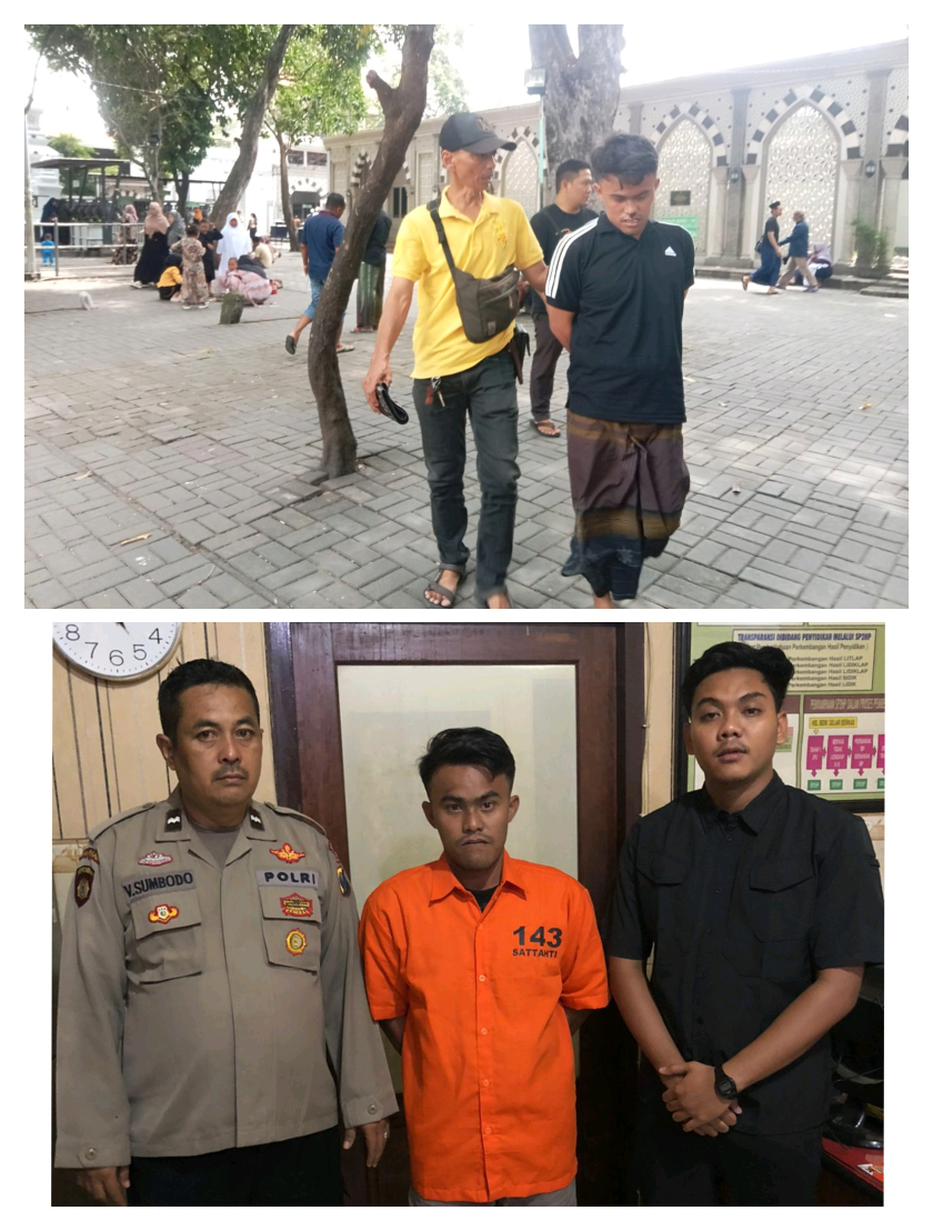 Petugas keamanan yang mencurigai gerak-gerik pelaku langsung melakukan pemantauan tertutup. Tidak berselang lama, pelaku berhasil diamankan di area barat kompleks Masjid Sunan Ampel tanpa perlawanan.