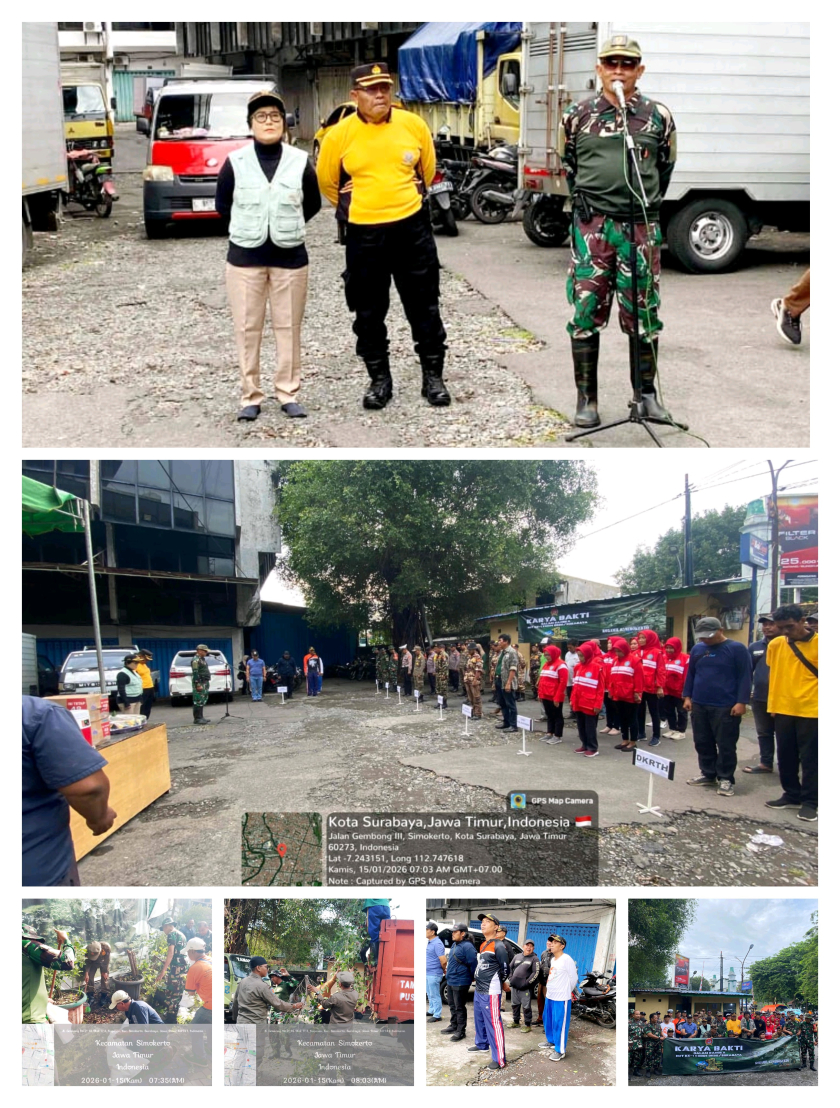 Peringatan HUT ke-1 Kodim 0830/Surabaya tidak berhenti pada seremoni belaka. Semangat pengabdian justru dibuktikan melalui aksi nyata di tengah masyarakat. Bertempat di Jalan Gembong III, Kelurahan Kapasan, warga RW 5 bersama 3 Pilar Kecamatan Simokerto menggelar kerja bakti massal peduli kebersihan lingkungan, Kamis (15/1/2026).