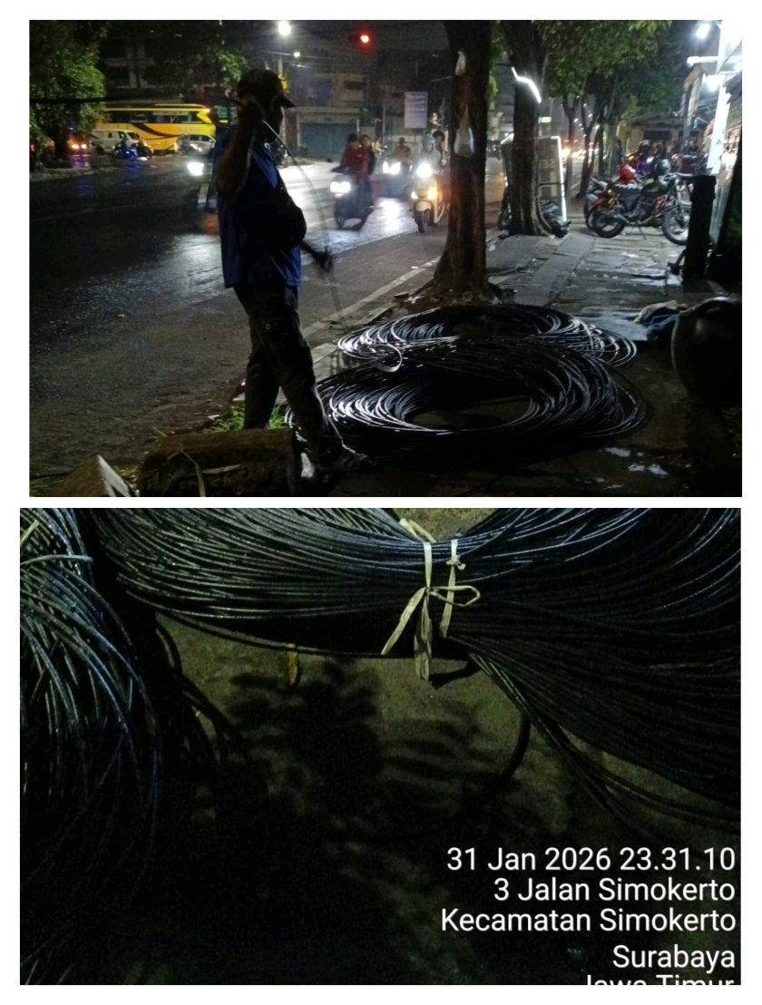 SURABAYA – Pemasangan kabel jaringan WiFi milik Padi Net yang dilakukan tengah malam di Jalan Simokerto, tepatnya di sebelah Indomaret, Kecamatan Simokerto, Kota Surabaya, menuai sorotan tajam. Aktivitas tersebut diketahui berlangsung pada Sabtu malam, 31 Januari 2026, sekitar pukul 23.31 WIB.