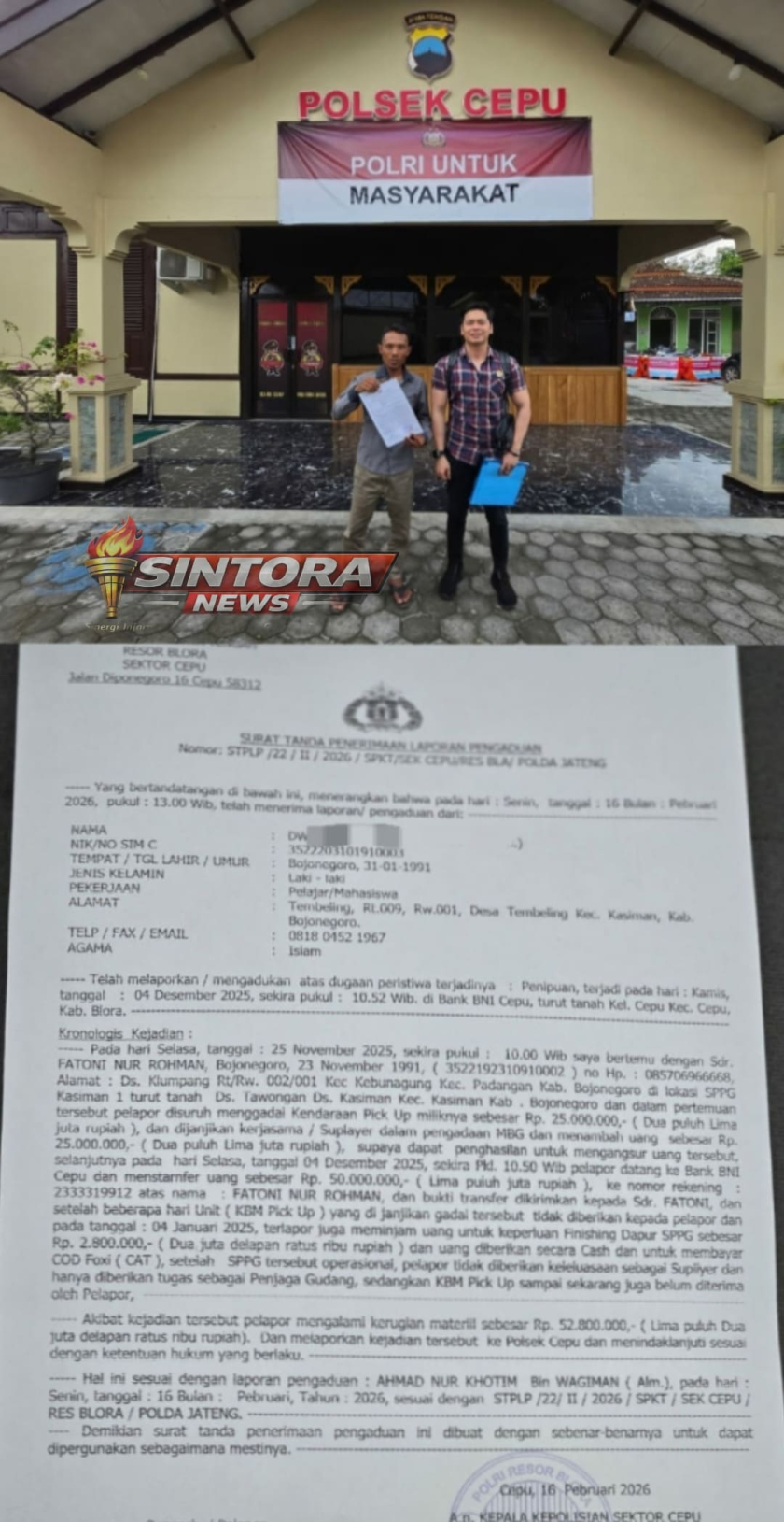 Merasa dirugikan, korban bersama kuasa hukumnya, R. Ferinando, S.H., melaporkan kasus ini ke Polsek Cepu dengan nomor laporan STPLP/22/II/2026/SPKT/SEK CEPU/RES BLORA/POLDA JATENG.