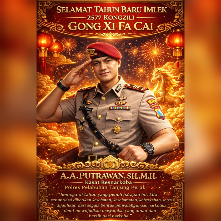 Surabaya, Selasa 17 Februari 2026 – Momentum Tahun Baru Imlek 2577 Kongzili dimaknai sebagai waktu penuh harapan, persaudaraan, dan semangat baru untuk menata kehidupan yang lebih baik. Dalam suasana yang sarat makna tersebut, Kasat Resnarkoba Polres Pelabuhan Tanjung Perak, A.A. Putrawan, S.H., M.H., menyampaikan ucapan selamat sekaligus pesan kuat kepada seluruh masyarakat.